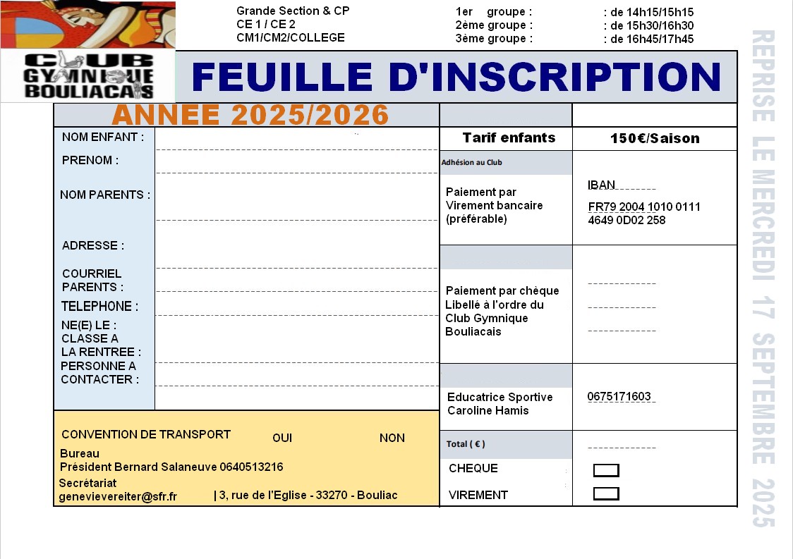 Attestation de paiement, club gymnique Bouliacais : Voir le document